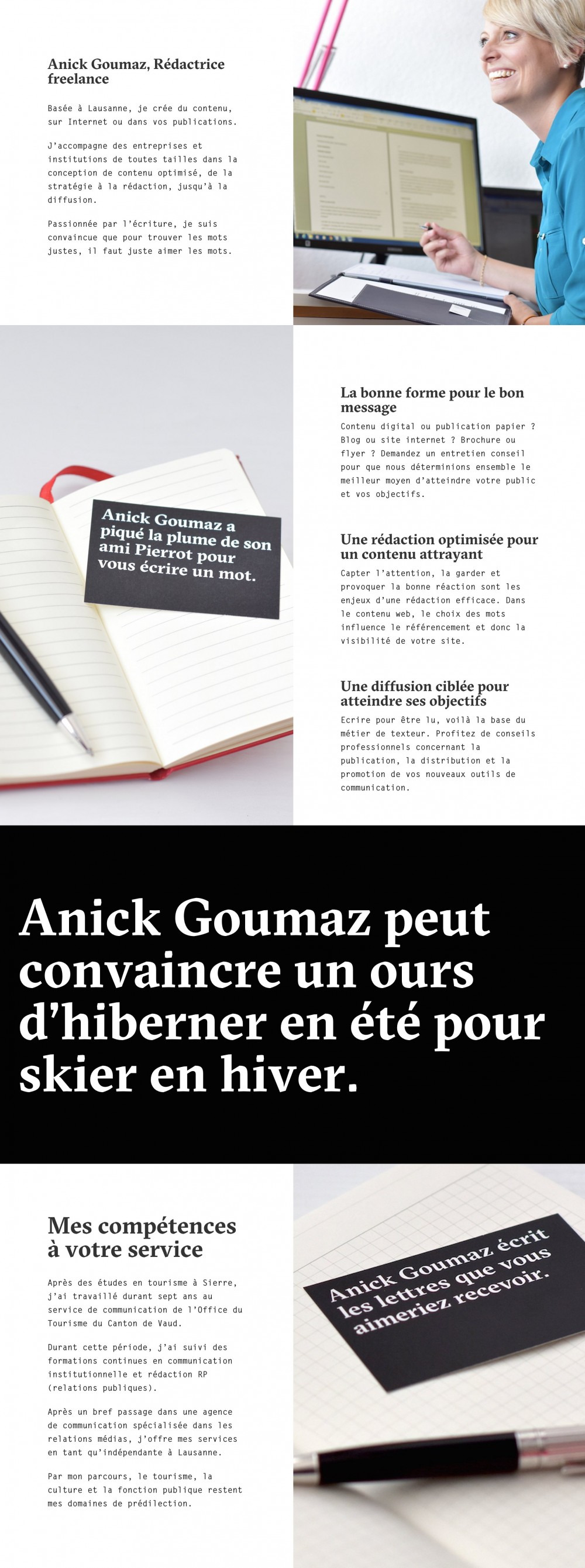 Création du site d’Anick Goumaz, rédactrice Freelance. Particularité du mandat : faire une présentation sur une page, sans menu tout en respectant le concept graphique établi par la graphiste.
